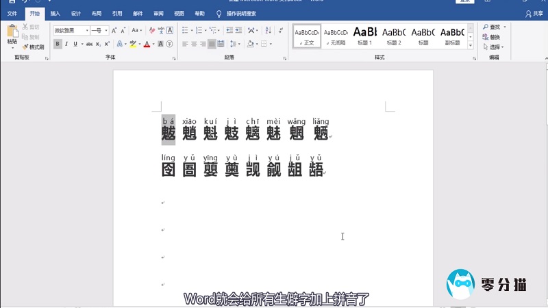 2.然后选择所有生僻字,点击开始功能区的拼音指南按钮,Word会给所有生僻字添加拼音。