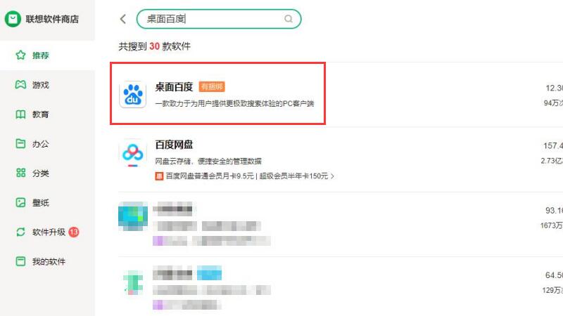 以联想软件商店为例,在电脑上打开,在搜索框中输入“桌面百度”。