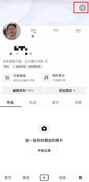 打开Tik Tok个人中心页面,点击右上角的三个栏。