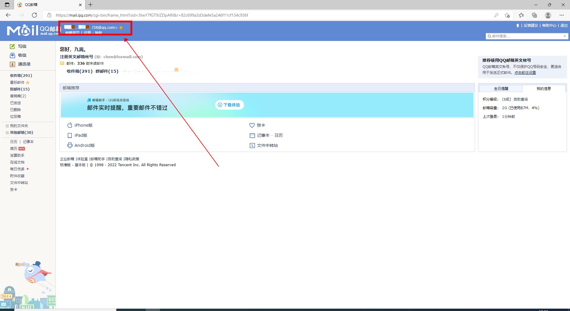登录QQ邮箱后,可以在详细界面的顶部查看自己的邮箱地址。