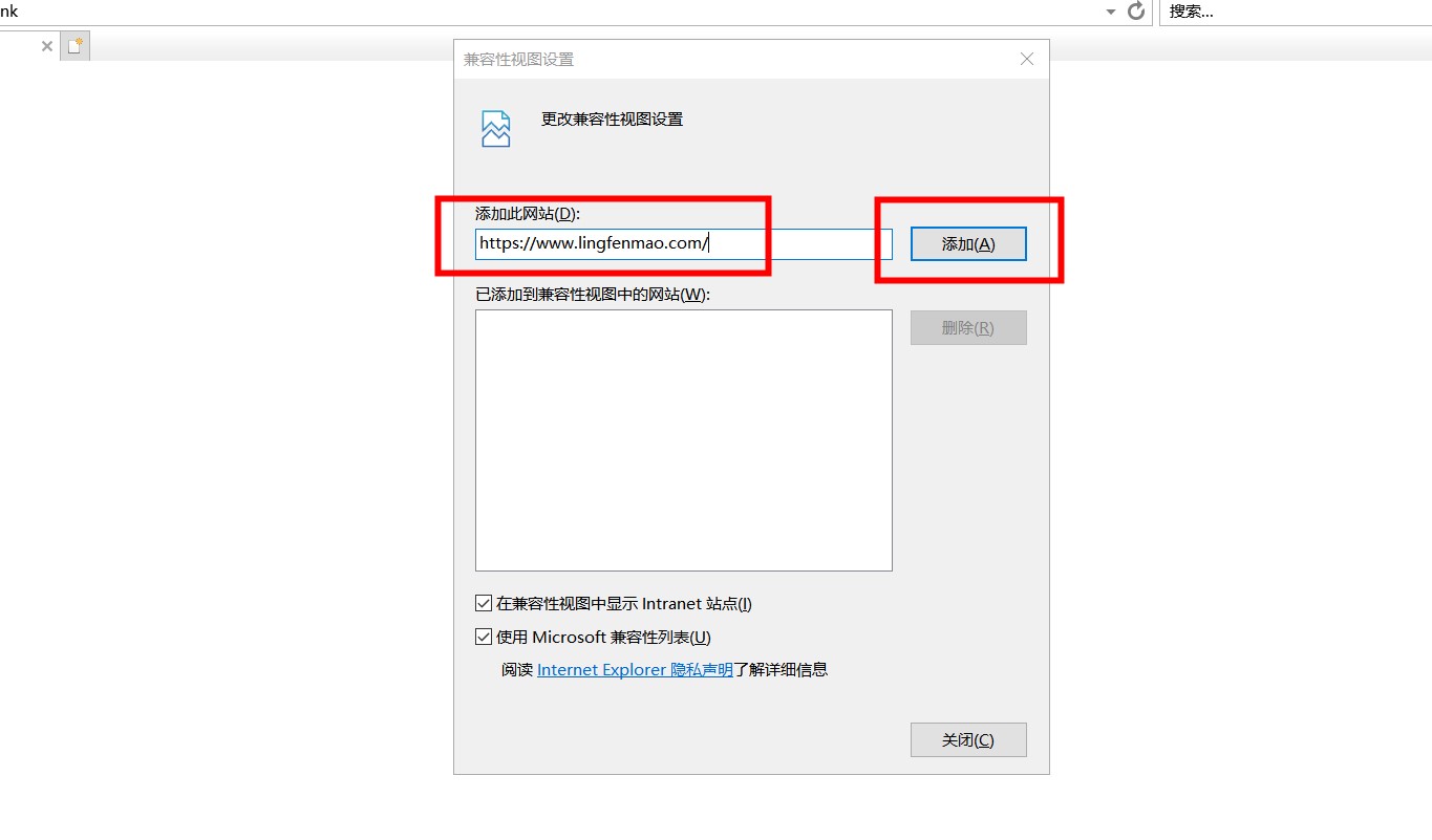 然后,在兼容性视图设置窗口中,输入相关的URL并单击添加。