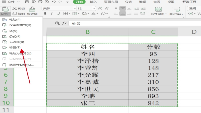复制要转置的数据,粘贴到任一单元格,点击开始,粘贴转置,将对应的文字进行反转。