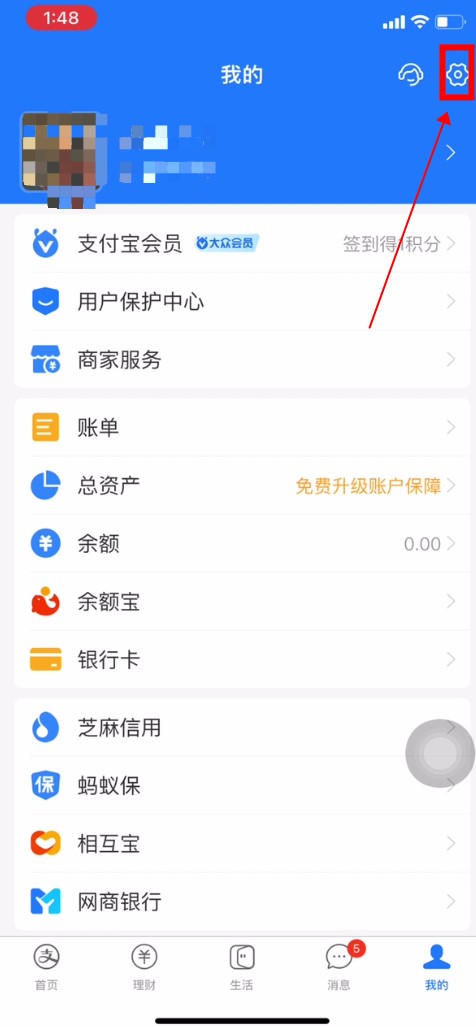 打开支付宝,在“我的”界面下点击右上角的设置。