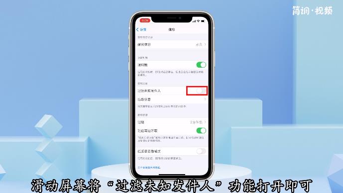 3.进入信息设置页面后,滑动屏幕开启“过滤未知发件人”功能。