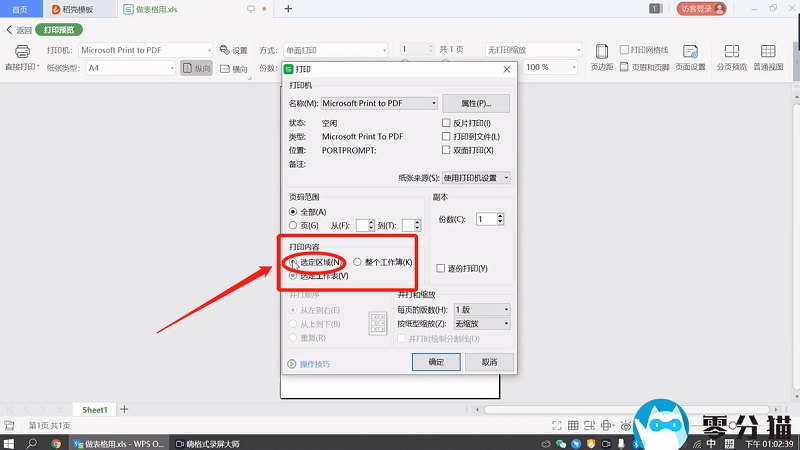 弹出打印窗口,在打印内容项的选定区域,点击确定。