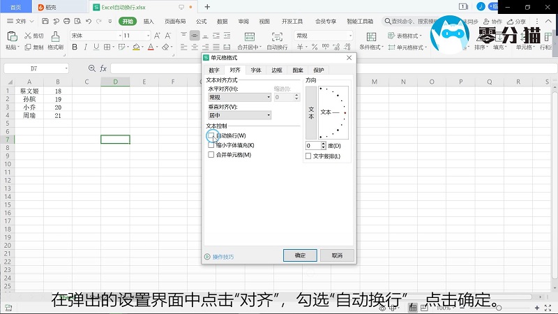 在弹出的设置界面点击对齐,勾选自动换行,点击确定。