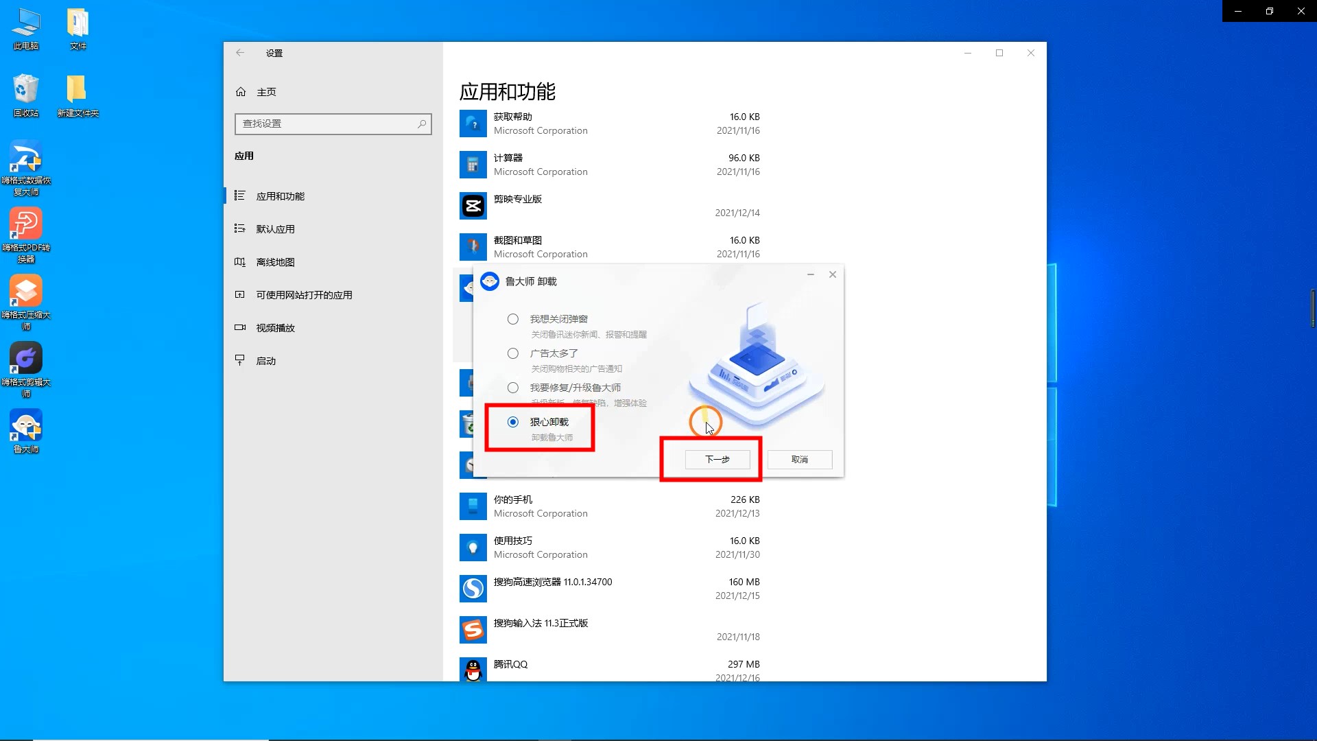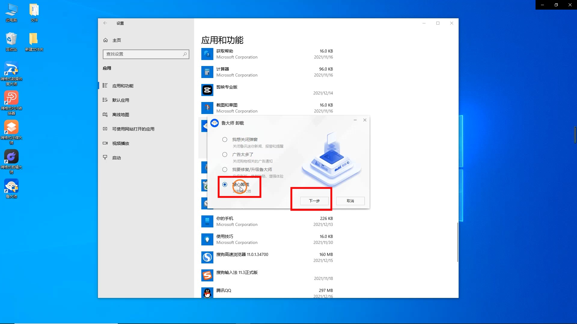 在鲁大师卸载界面,点击“用心卸载”和“下一步”。