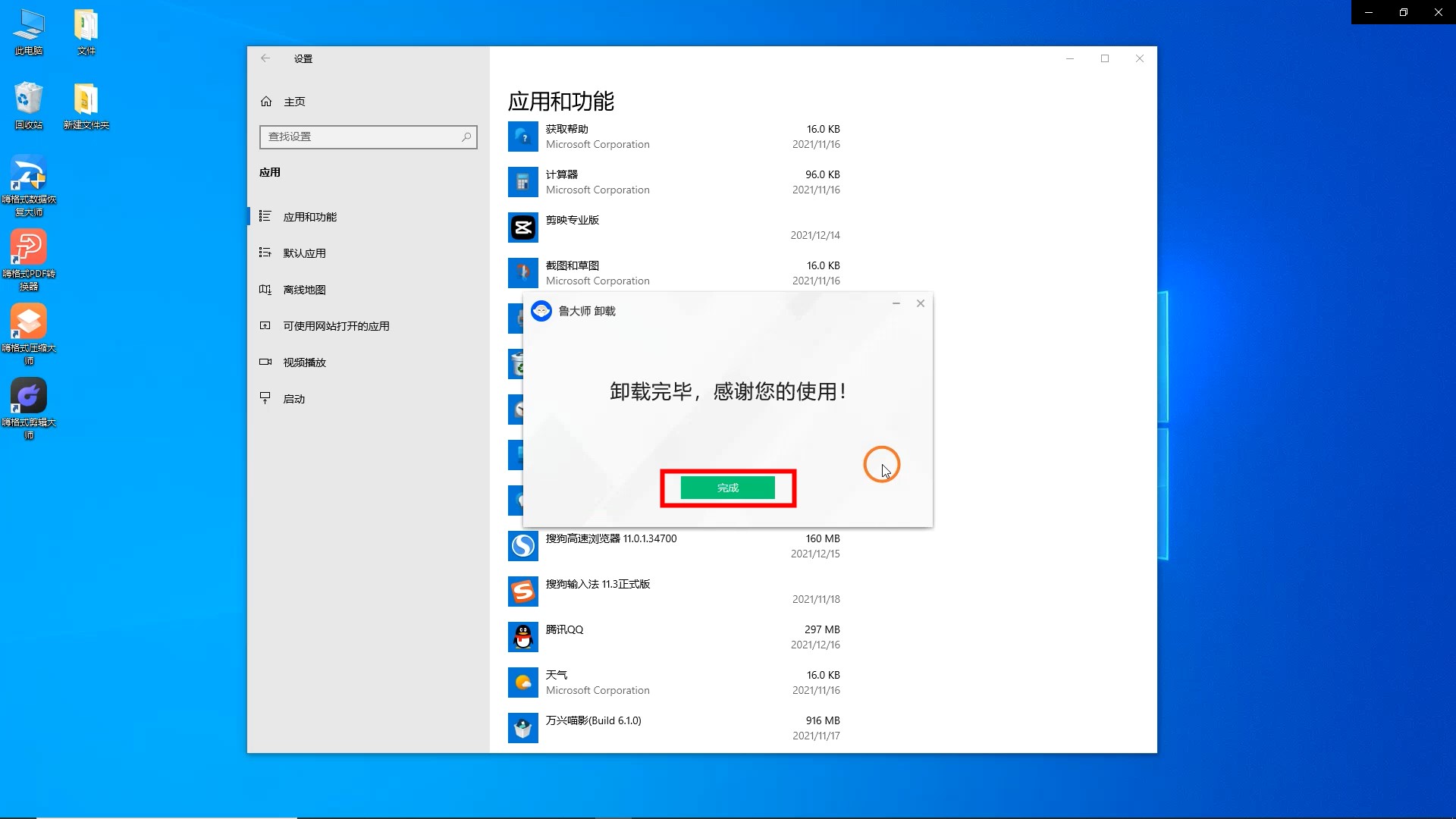 等待鲁大师卸载,然后点击“完成”。