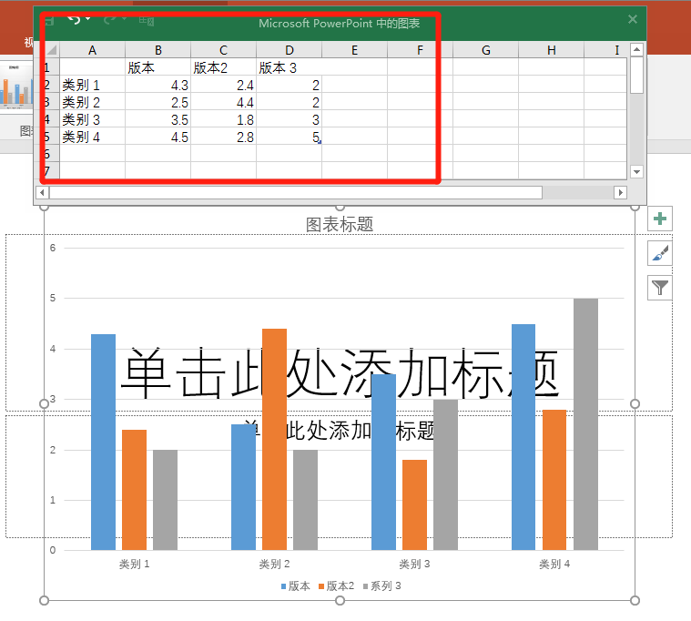 5.插入图表后,在弹出的Excel表格中修改为所需数据。