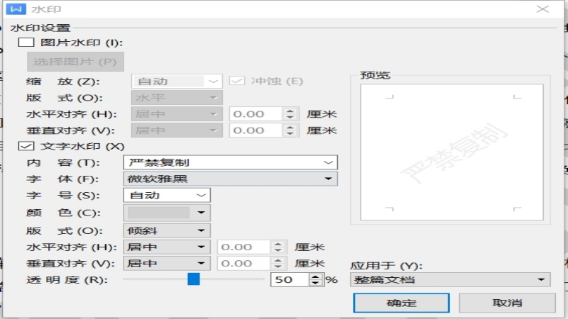 3.选中设置文本水印,输入要设置的内容,然后调整格式,并单击确定。