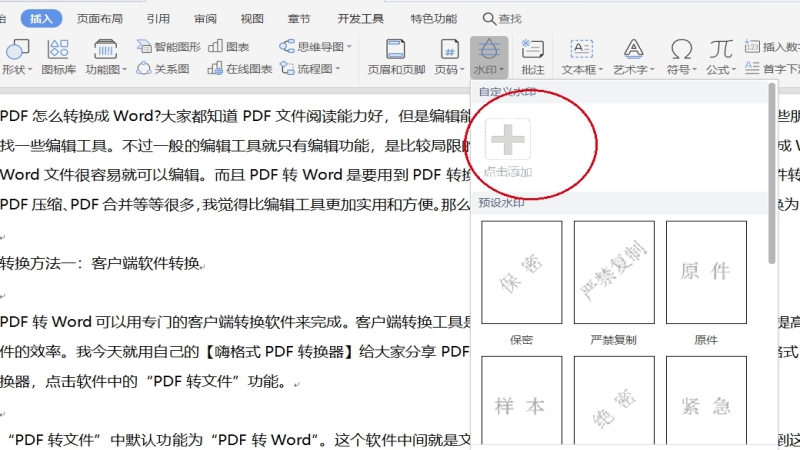 如果需要给Word文件添加水印,可以使用WPS自带的水印功能添加。以WPS2019为例。具体操作如下: