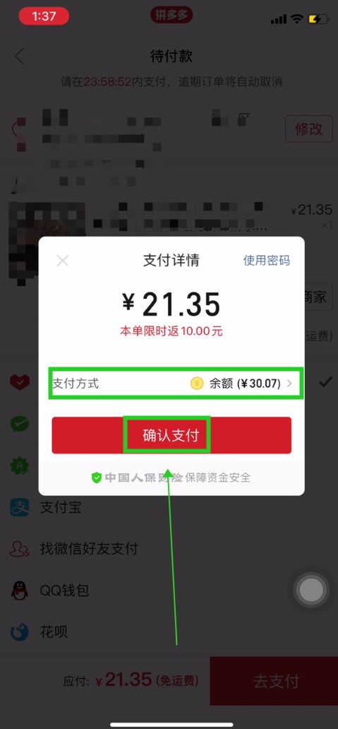 在付款详情中,选择余额作为付款方式,然后点击“确认付款”。