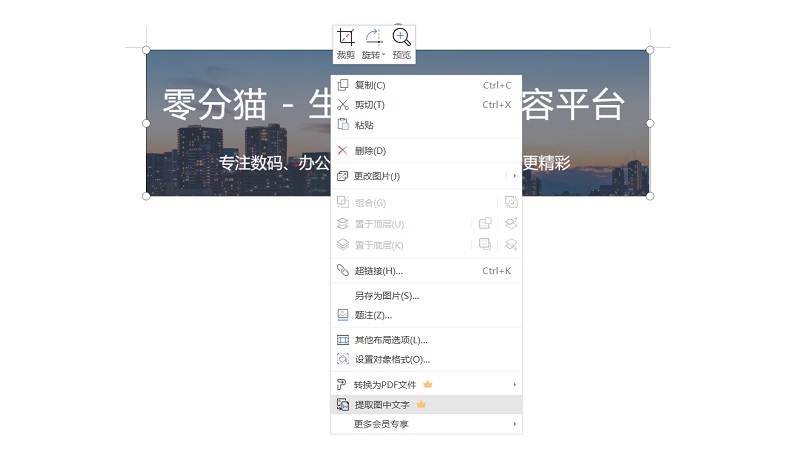 2.选中图片,点击右键,选择“提取图片中的文字”。