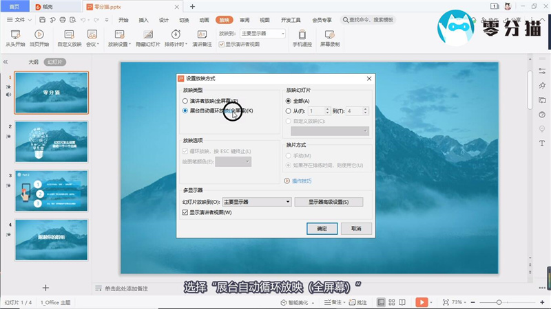 然后,在弹出窗口中找到“展示类型”,选择“展台自动循环展示(全屏)”。