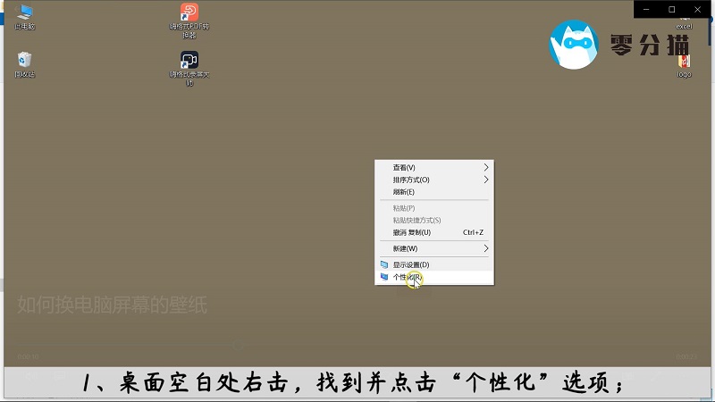 1.右击桌面空白处,找到并点击“个性化”选项;