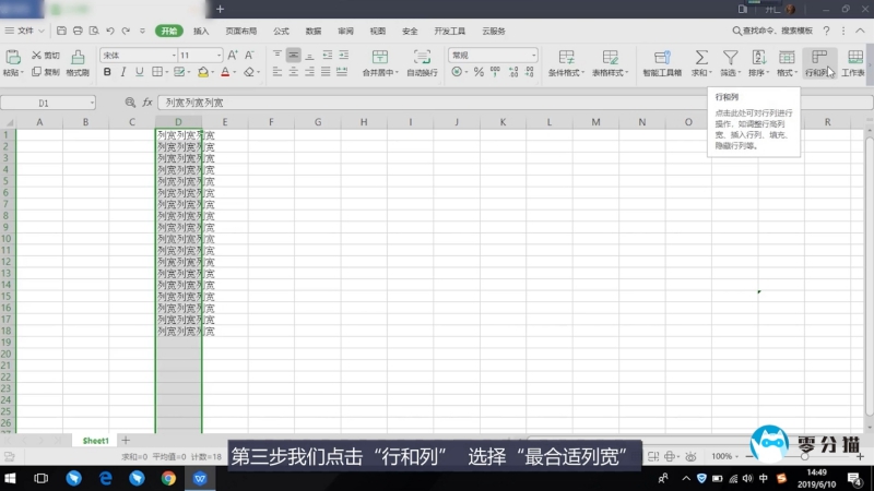 第三步:点击“行列”,选择“最合适的列宽”。选择完成后,可以看到列宽自动调整到最合适的大小。如果需要自定义列宽的大小,请选择列宽并输入列宽值。