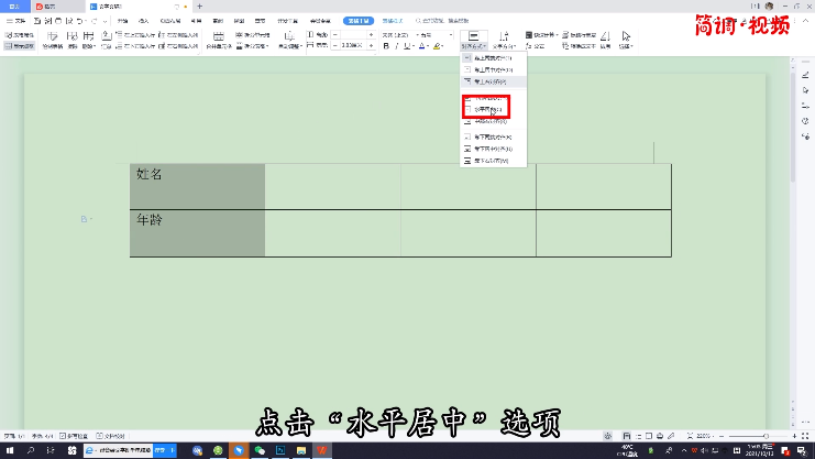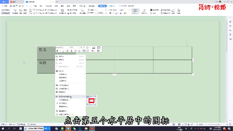 3.在对齐模式下,单击第五个水平居中图标,将表格内容设置为水平居中。