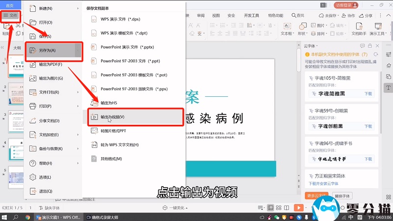 打开我们做好的PPT,点击文件,选择另存为,点击输出为视频。