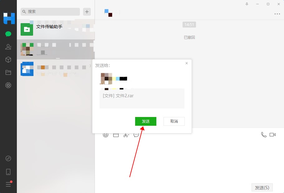 文件压缩后,打开微信聊天界面,将文件压缩包直接拖拽到聊天窗口,点击“发送”。