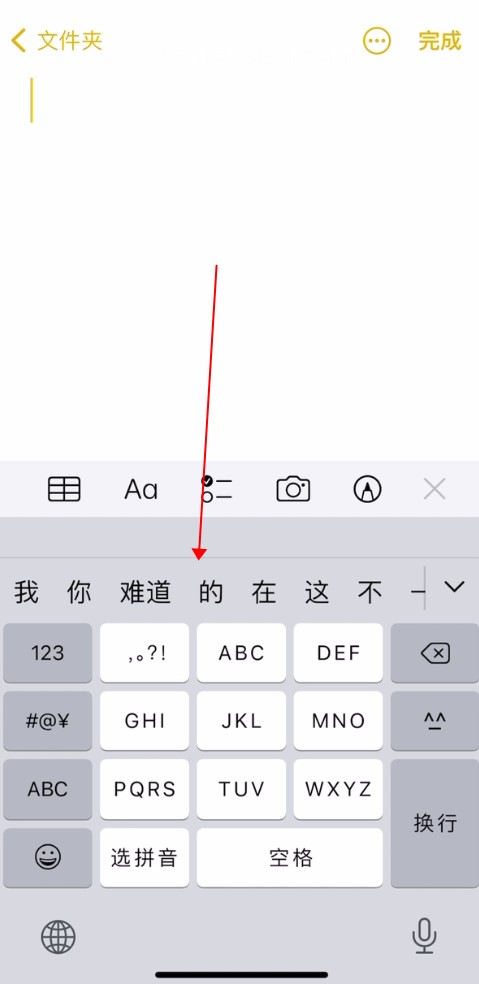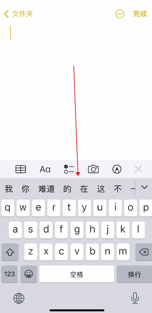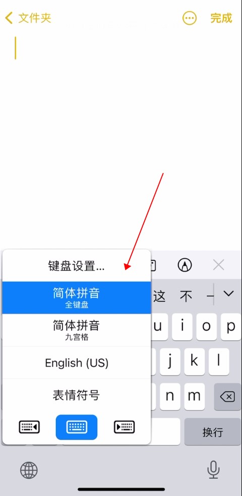 以编辑iPhone 12 mini的备忘录中的内容为例。首先,在手机中创建新的备忘录。此时,键盘输入法显示为“全键盘”。