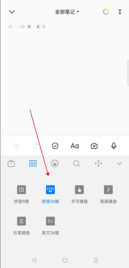 以OPPO Reno 7的笔记中编辑内容为例。在手机中创建新便笺,键盘显示为拼音26键。