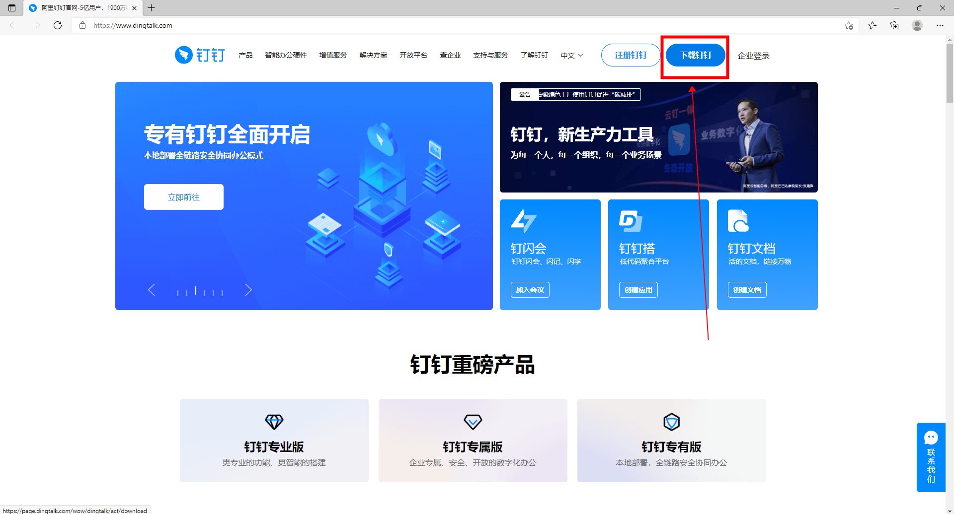 首先进入钉钉官网,点击顶部“下载钉钉”安装钉钉电脑版。