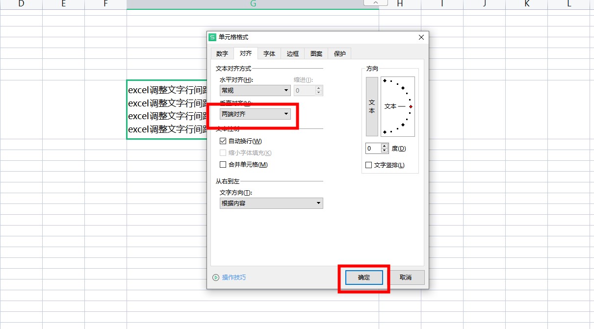 在单元格格式中,选择对齐选项卡,点击“垂直对齐”,选择“两端对齐”,设置完成后点击确定。