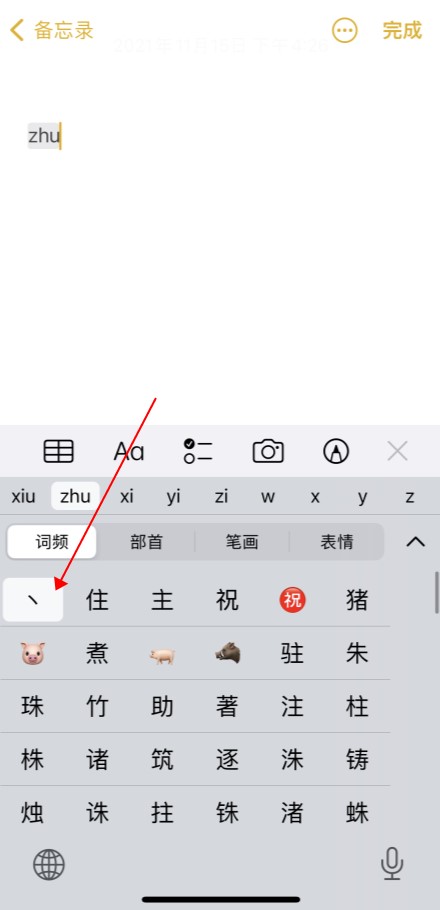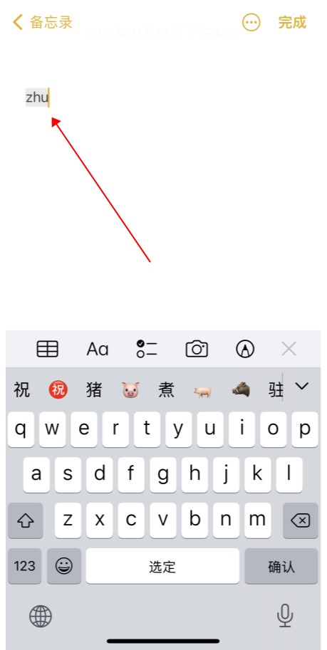 以iPhone 12为例。苹果手机的拼音是在输入法中输入“朱”,分为以下四个步骤:
