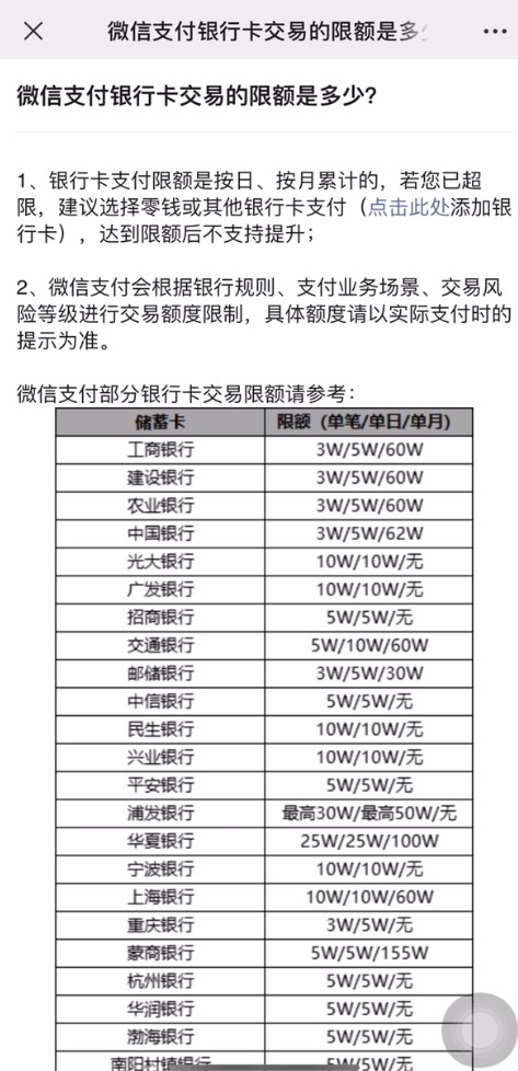 在这里可以查看微信支付的部分银行卡交易限额的参考金额。