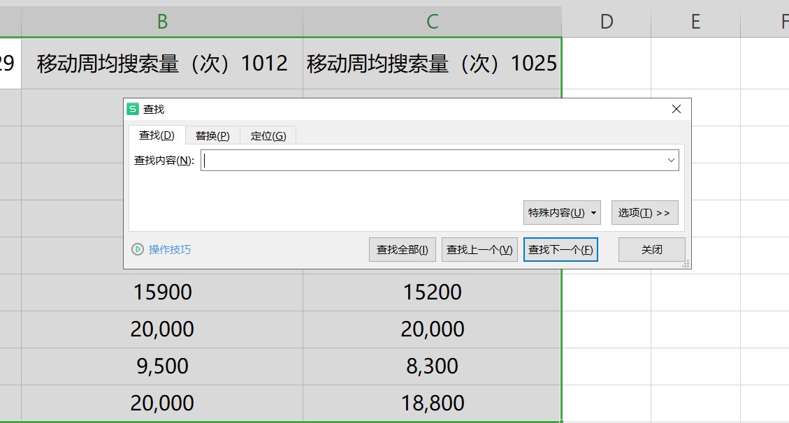 以WPS为例,Excel表格搜索功能在“查找”下分为以下四个步骤: