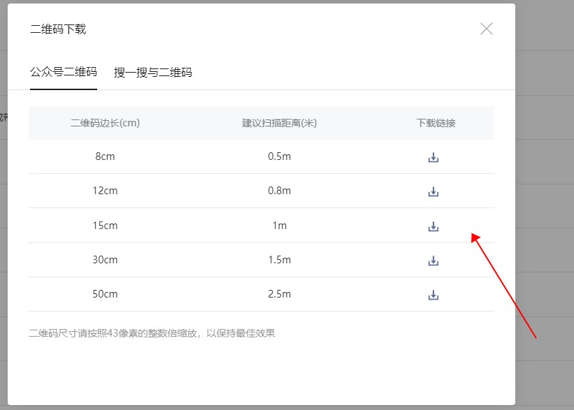 选择尺寸获取二维码。
