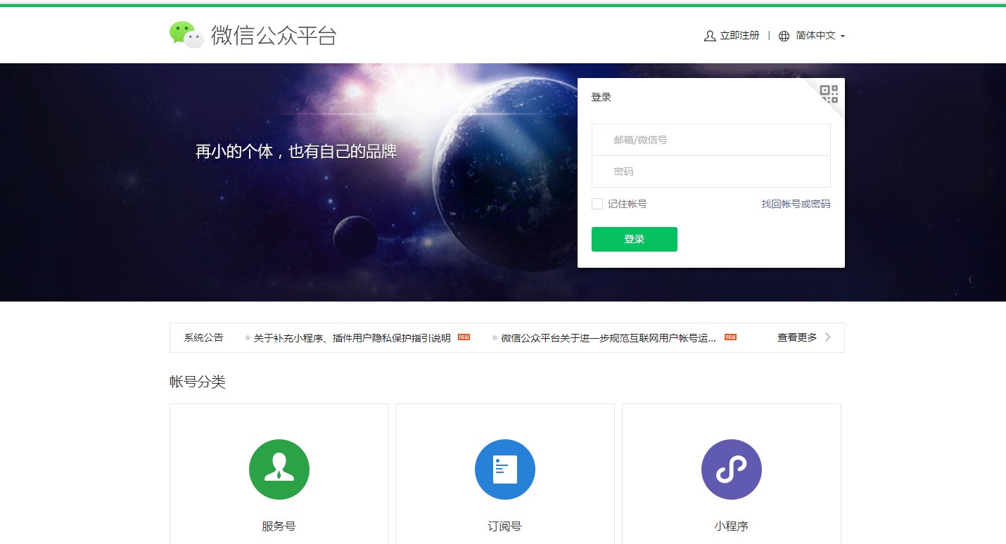 进入微信公众平台登录微信官方账号。