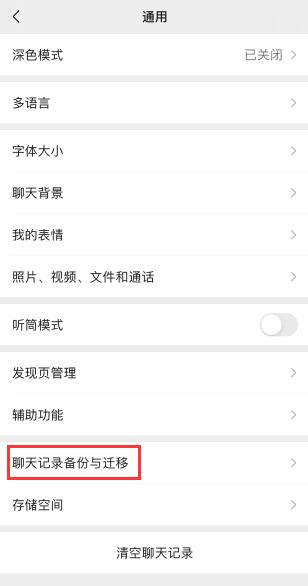 然后单击“常规”页面上的“聊天记录的备份和迁移”选项。
