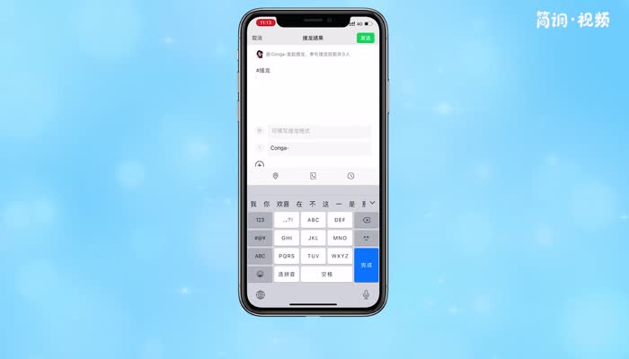 4.在新页面中,输入接龙内容、格式、答案等。然后点击右上角的“发送”按钮启动接龙;