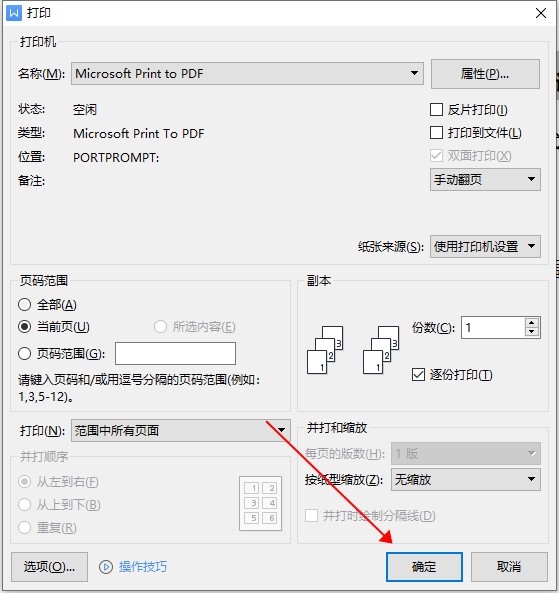最后,设置要打印的文档的页码和范围,然后单击确定。