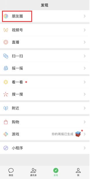 打开微信发现页面,点击“朋友圈”选项。