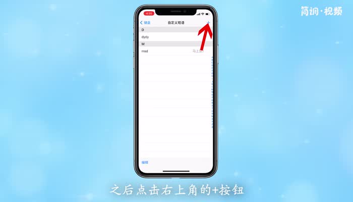 4.点击自定义短语选项,然后点击右上角的“”按钮,进入自定义短语编辑状态;