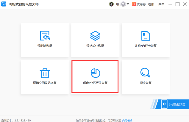 打开“Hi格式数据恢复大师”,点击“磁盘/分区丢失恢复”。