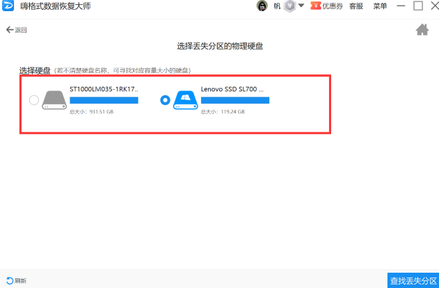 打开“磁盘/分区丢失恢复”,进入页面,点击“待恢复磁盘”。