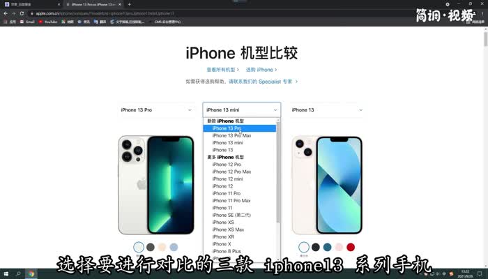 4.页面跳转后,选择三款iphone13系列手机进行对比;