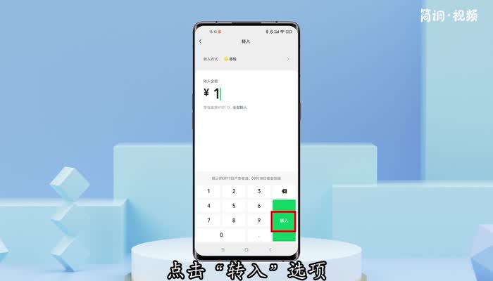 4.点击全部转入,或输入转入金额,点击“转入”选项,输入支付密码,转入成功。