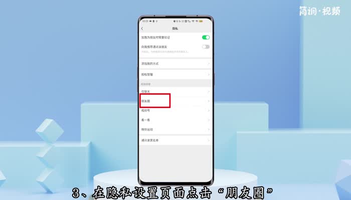 3.在隐私设置页面点击“朋友圈”,页面跳转后点击“不让他(她)看”;
