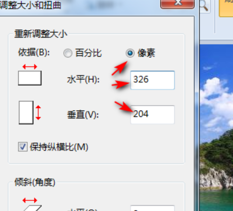 5.打开调整大小命令后,在弹出的选择框中选择“像素”,根据实际需要调整“水平”和“垂直”的值,完成图片的压缩。