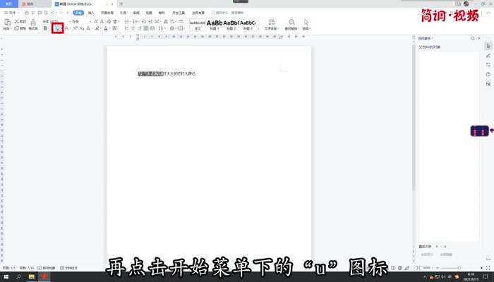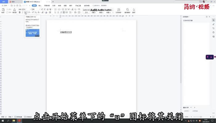 2.打开文档后,点击开始菜单下的“U”图标将其关闭,这样再次输入内容时就不会出现横线;