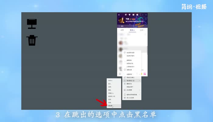 3.在弹出的选项中点击“黑名单”,在弹出的窗口中点击“确定”。