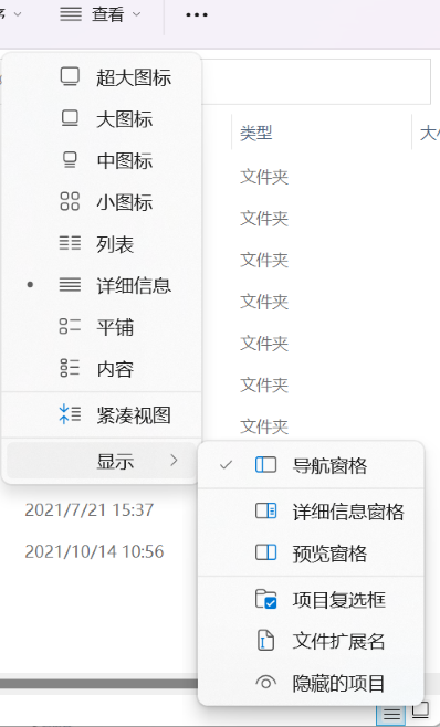 单击二级菜单中的“显示”以显示隐藏的文件和文件夹。