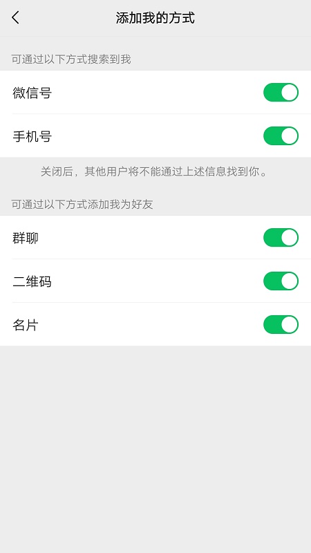 2.隐私设置中关闭了添加方法。在“我-设置-隐私”中找到“添加我的方式”,打开所有添加我的方式,别人也可以通过这些方式添加到你。