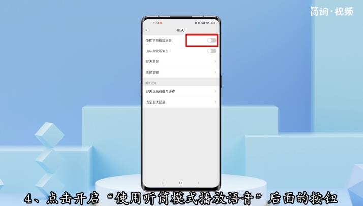3.进入设置界面后,点击“聊天”选项,然后找到“使用听筒模式播放语音”;