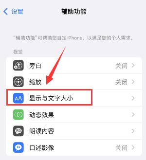 进入辅助功能页面后点击“显示和文本大小”。
