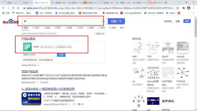 打开浏览器,在搜索栏输入“IP”,点击搜索,就可以看到IP地址。